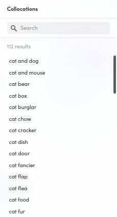To filter collocations, enter a string in the search box under Collocations and press Enter, only collocations containing the string will be shown. Select the X icon