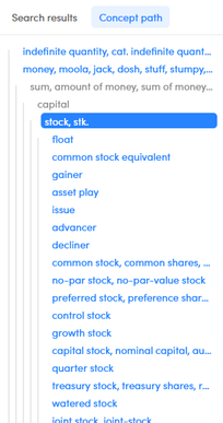 The resulting view is divided into two parts. On the left side there are two tabs, Search results which continues to show the results of the last search in a more compact form and Concept path which shows the hierarchical context of the current concept. The other part of the view shows: