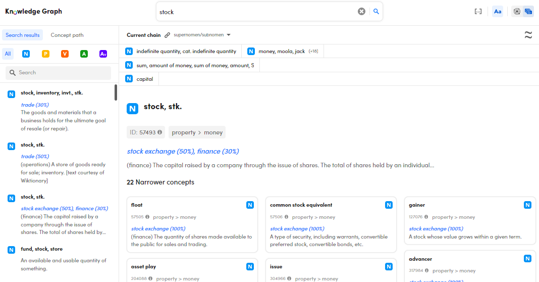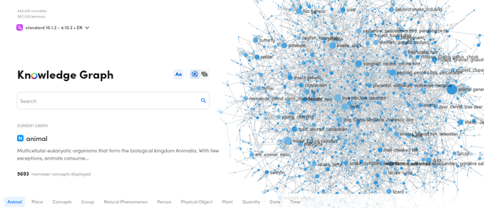 The number of concepts (also called syncons) and the number of concept-defining lemmas of the knowledge graph are indicated above the knowledge graph selection dropdown list.