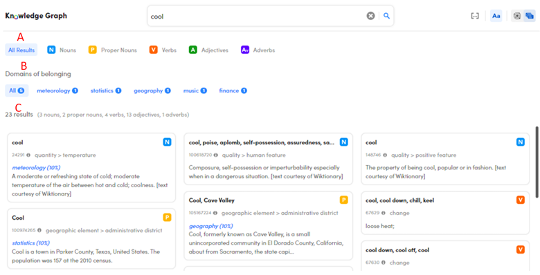 - Number of results—grand total and by part of speech—and result concepts displayed as cards (C).