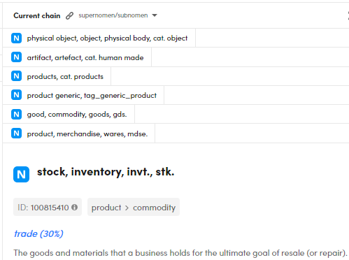 - In the Broader chain and in the Narrower concepts tabs, respectively, a list of ascendant concepts and the list of child concepts. For each concept the lemma(s), the possible knowledge topics and the definition are reported.