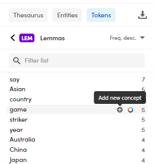 You can also create a concept from the Entities or Tokens tab, both in list and detail views.
