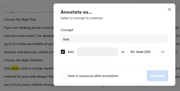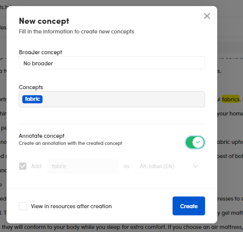 Create Concept displays a window with which you can create a new concept, organize it in the taxonomy, and annotate it by selecting the toggle button Annotate concept.