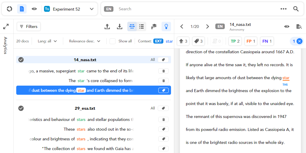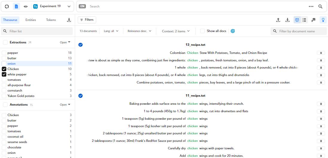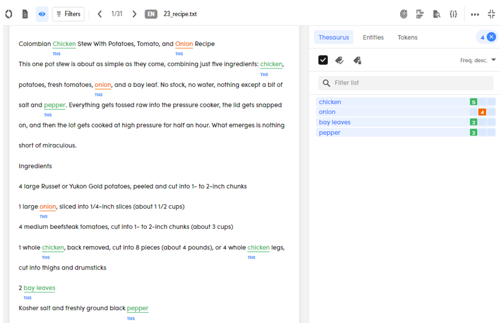 - Use the right panel to highlight occurrences of entities and/or tokens in the text, as described in this other article.