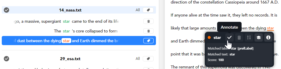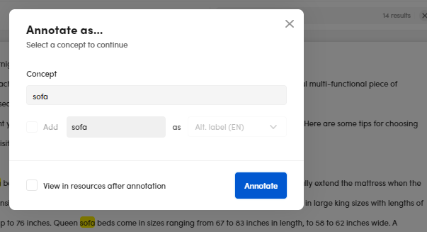Information regarding the annotated concept, such as broader concept, preferred label and alternative label, is displayed in a pop-up window.