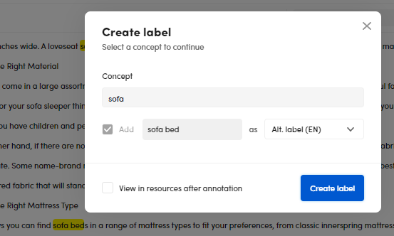 Create label displays a window with which you can add a concept as Alternative label or Hidden label.