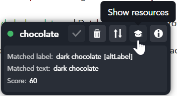 To show an annotated concept in the Resources tab, select an annotation—or an extraction—then select Show resources from the pop-up toolbar.