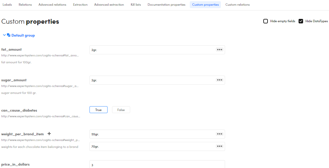 • Check or uncheck Hide DataTypes to respectively hide or show the property data types. To give the property a data type, when unchecked, select the dropdown menu below the property value.
