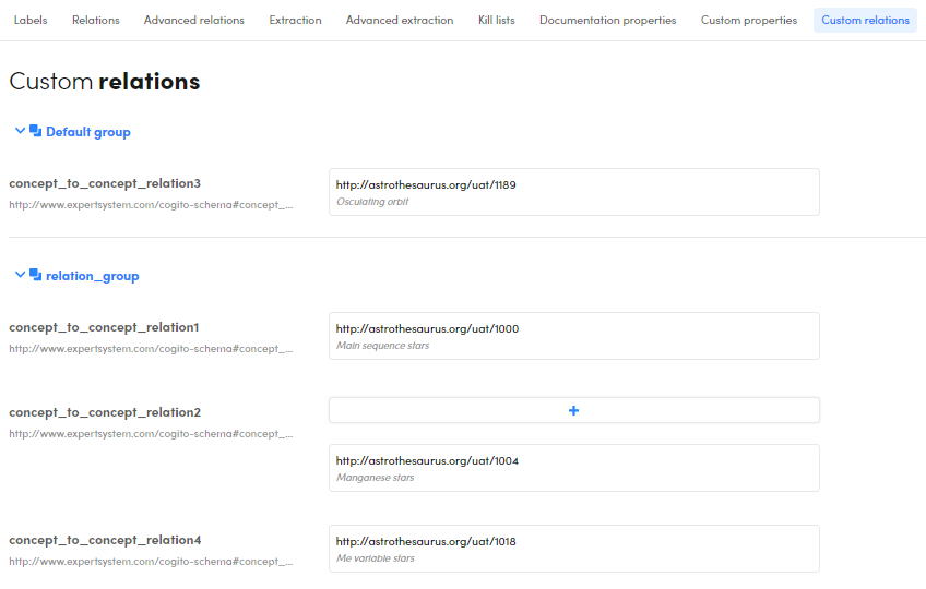 The custom relations for the current concept are managed in the Custom relations tab of the Edit concept panel.