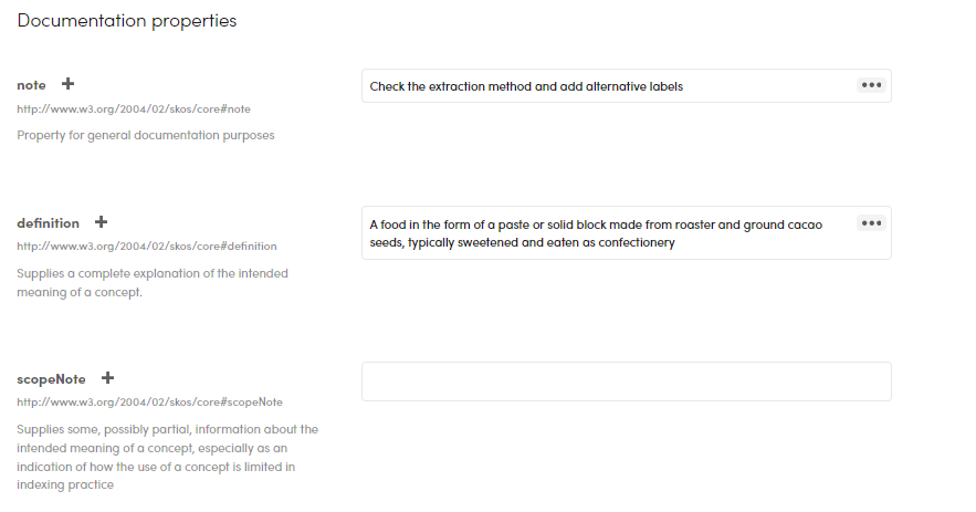 Use the Documentation properties tab in the Edit concept panel to view, edit and add documentation data to the selected node.