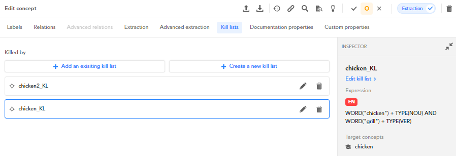 The kill lists associated with the current concept can be managed in the Kill lists tab of the Edit concept panel.