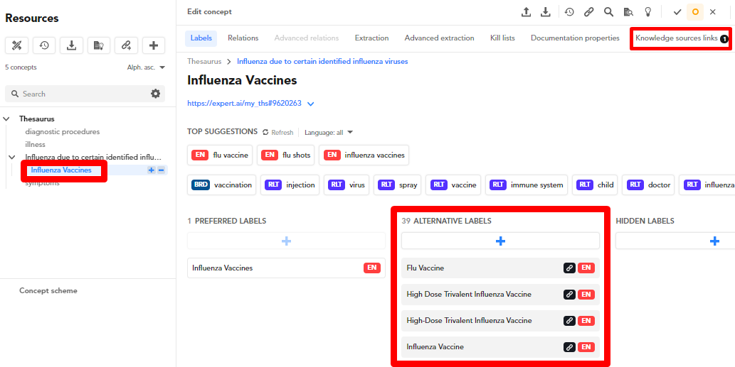 When you create a concept starting from a knowledge source, the new concept has a preferred label which is a copy—or clone—of that of the source concept, while any alternative labels are linked.