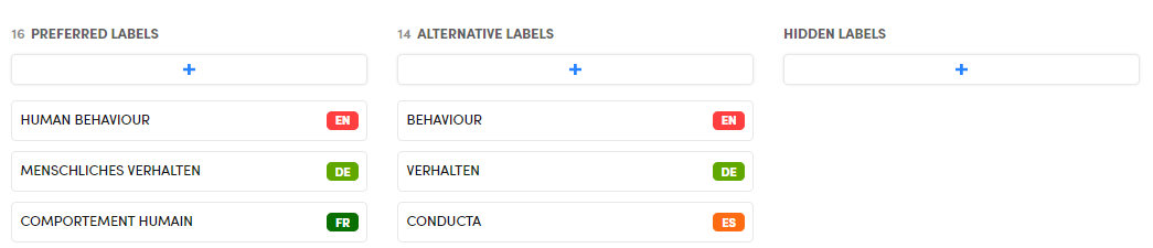 - Select the plus button under a column heading (PREFERRED LABELS, ALTERNATIVE LABELS or HIDDEN LABELS). ). An input field appears under the button.