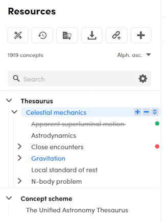 In the thesaurus tree, the validation state is represented by a colored dot beside the concept. There is no dot for candidate concepts.