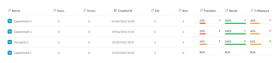 The experiment list displays a summary of the experiments features and their main quality indicators. While Ext. represents the number of extractions, Ann. represents the number of annotations.
