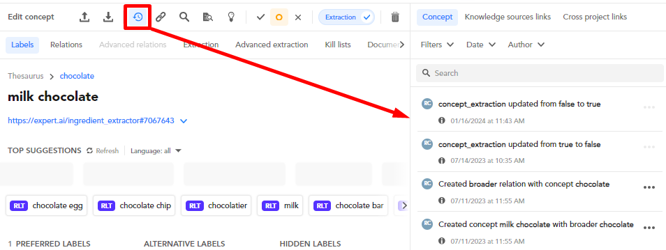 In the Edit concept panel you can toggle the history of the concept by selecting Toggle concept history