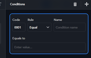 - Default condition: toggle switch. When it is turned on, the default condition is available. The default condition code is ELSE and cannot be changed, but it is possible to associate an extended name to the condition in the Name field.