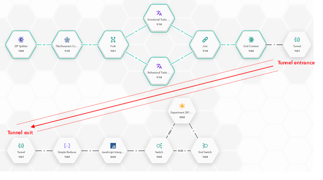 The Tunnel operator is used to create invisible connections between portions of a complex workflow to keep it visually compact. So, if the diagram is going to be large, you can break it in smaller pieces and connect them using tunnels.