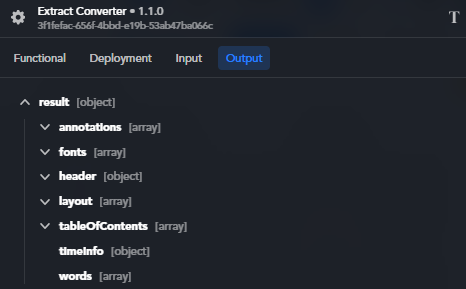 The output of an Extract Converter block is a JSON object with the following structure: