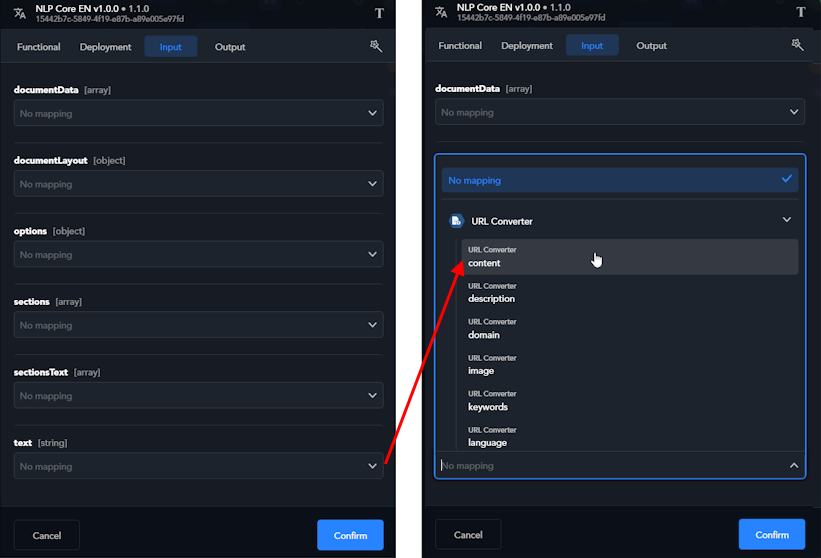 Typically, the content key is mapped to the text input variable of a downstream model block.