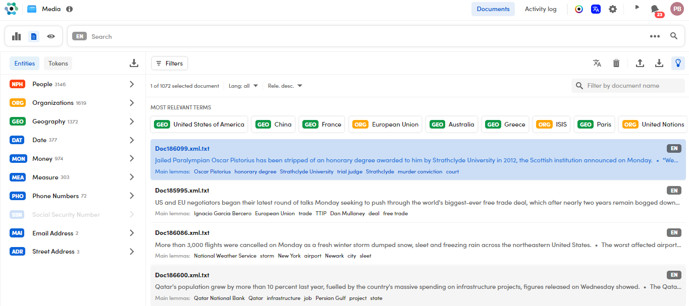 In the Entitites tab you find an item for each named entities type or group of types. For example, Geography and Organizations are groups of types: the former includes buildings and environments, the latter companies and mass media.